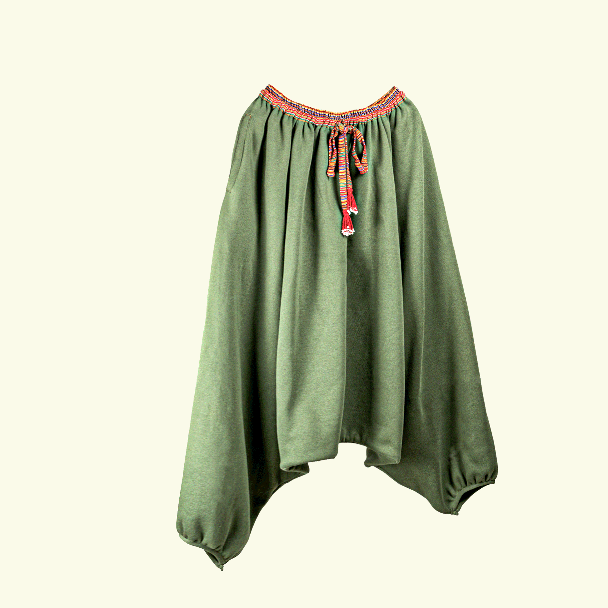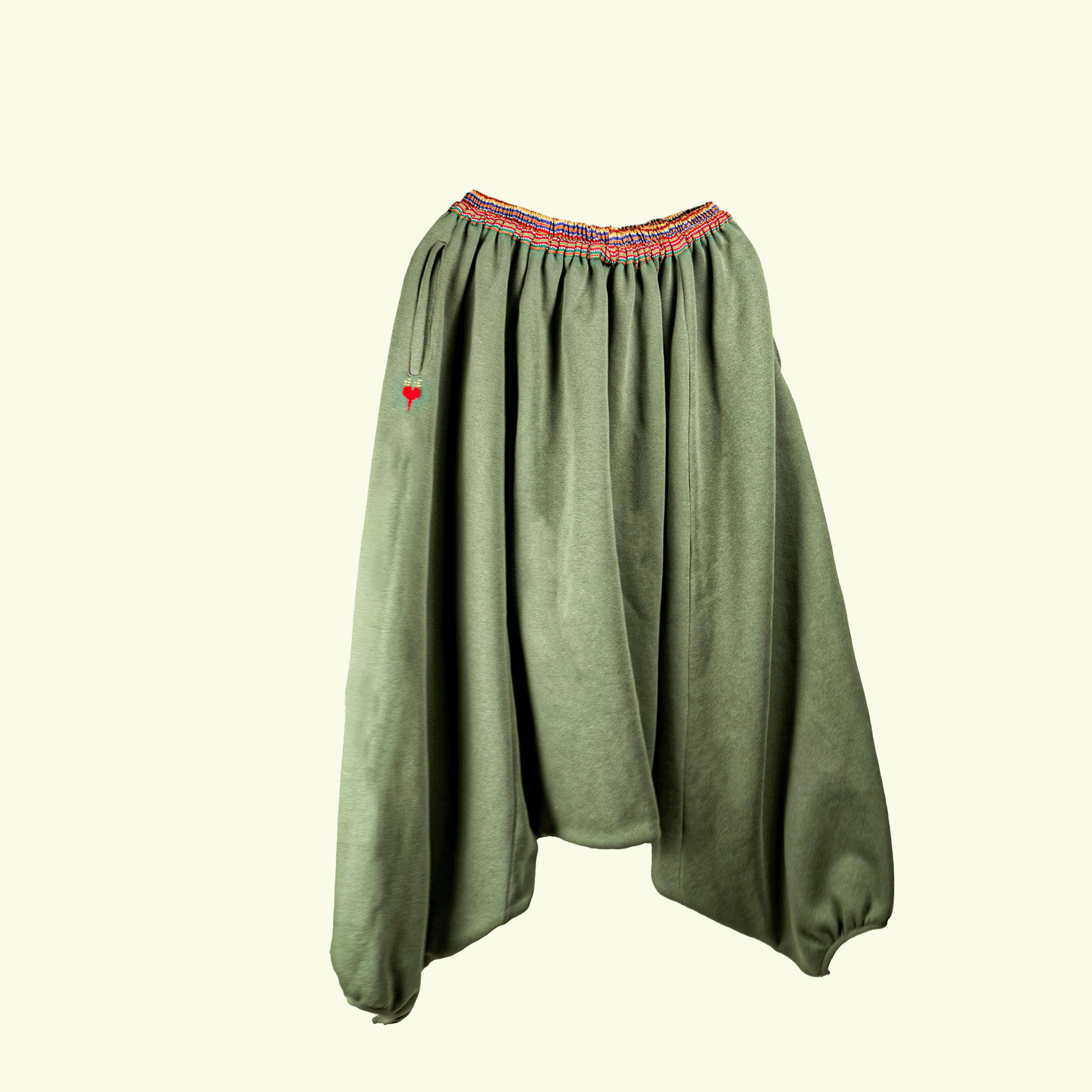 Abasen is our unisex bottom inspired by traditional drape shalwar and redesigned for weather and comfort. Paired with its fleece top (Azlan), this thick shalwar is made to keep you warm. Slits at the hem allow movement and is secured with Susi lace and hoops. Traditional tassels and intricate beadwork embellish the waistband, and side pockets to improve functionality. It is finished with our signature YBQ Heart and Braille logos.