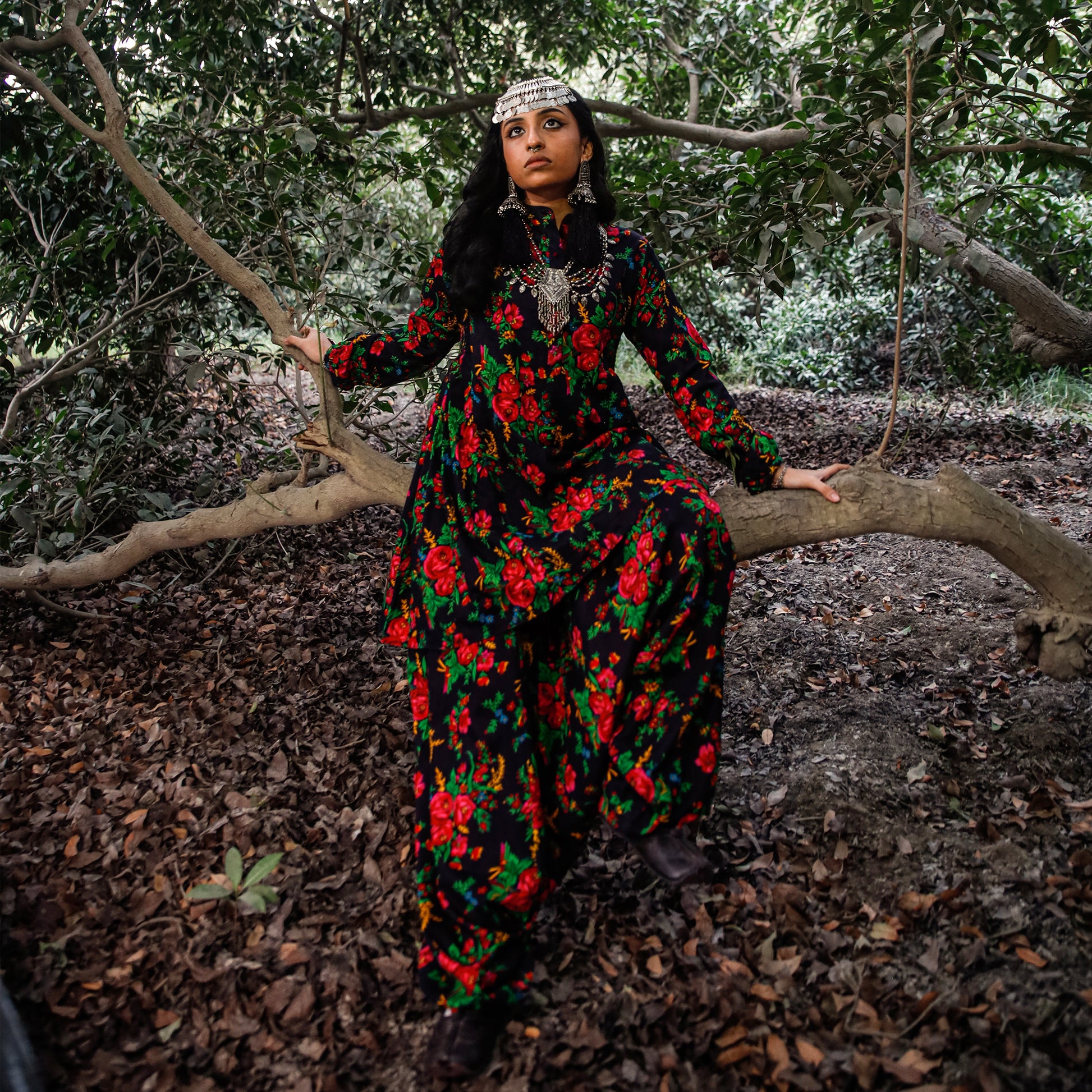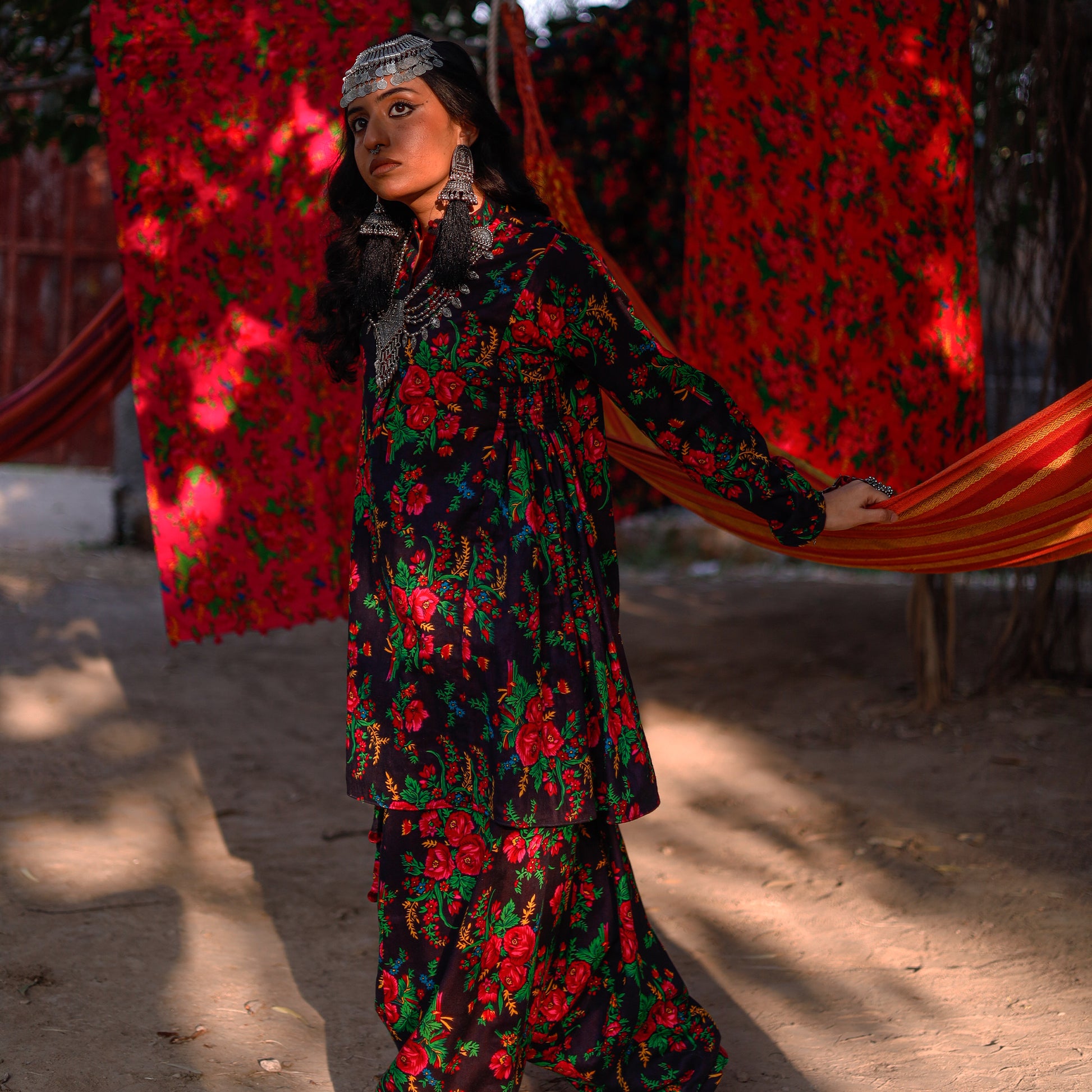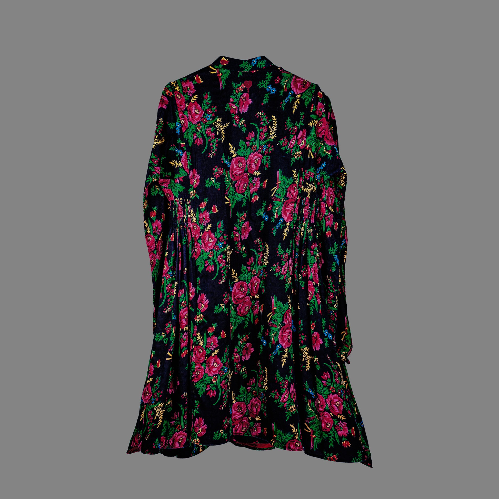 Idhas-OI is a short-length frock falling above the knee, crafted from floral printed fabric with velvet finishing and red lining. Designed with side gathers, velvet buttons along the front, and a Mandarin collar, it features puff sleeves with opening details at the hem. Finished with YBQ signature Heart and Braille logos.