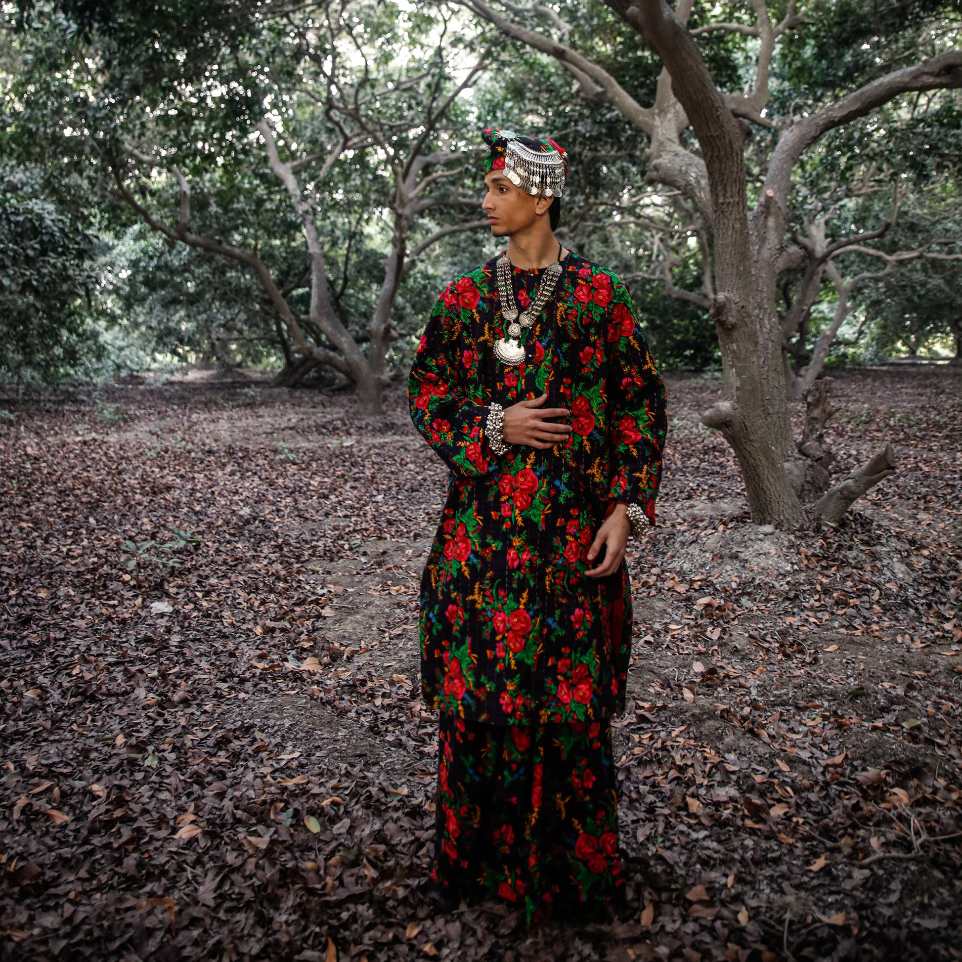 Jaan - OI is a crew kurta crafted from floral printed fabric, detailed with vertical running stitches across the entire silhouette. It features full-length sleeves with frayed edges and is finished with velvet accents and a striking red linning beneath. Designed for comfort and ease, Jaan-OI includes side pockets and is completed with our signature YBQ Heart and Braille logos.