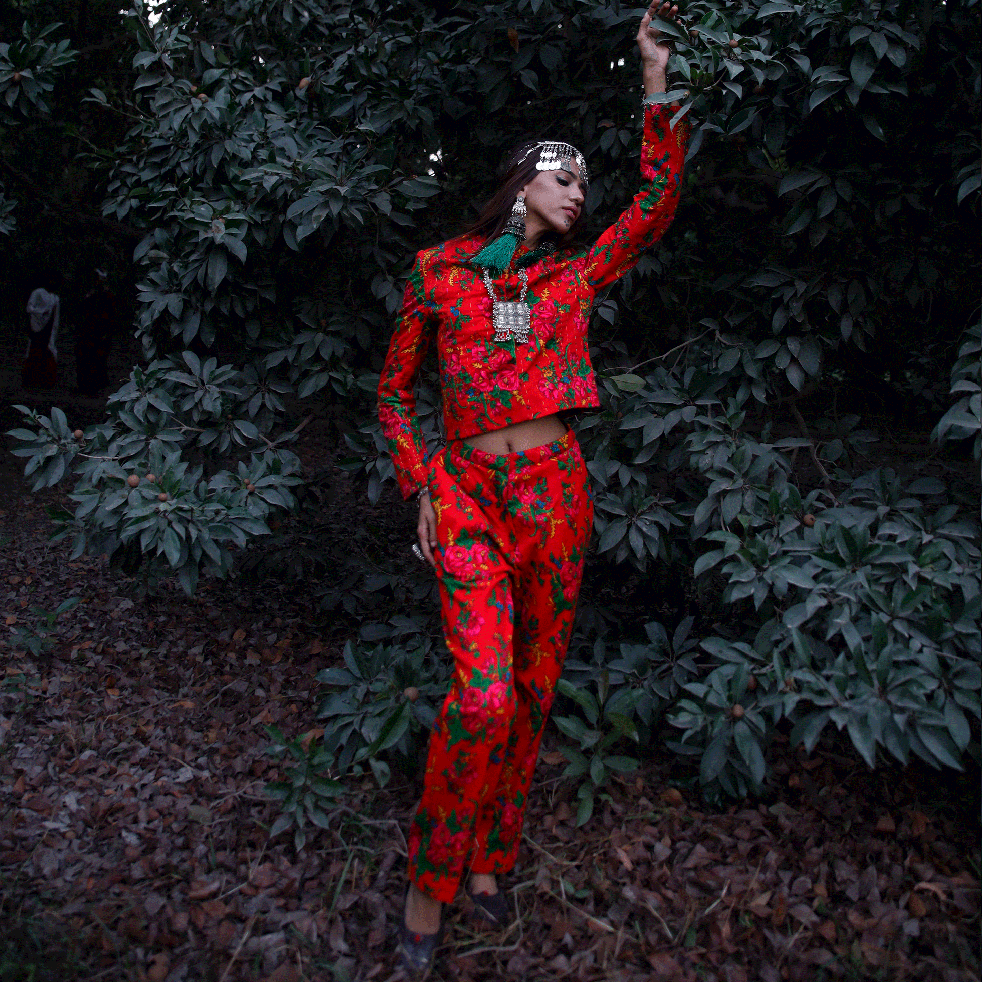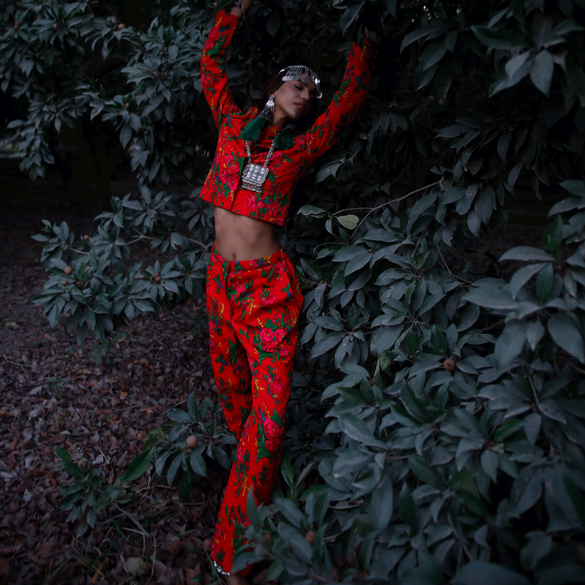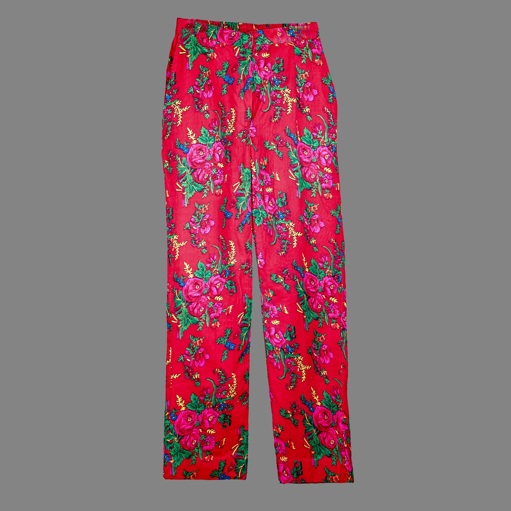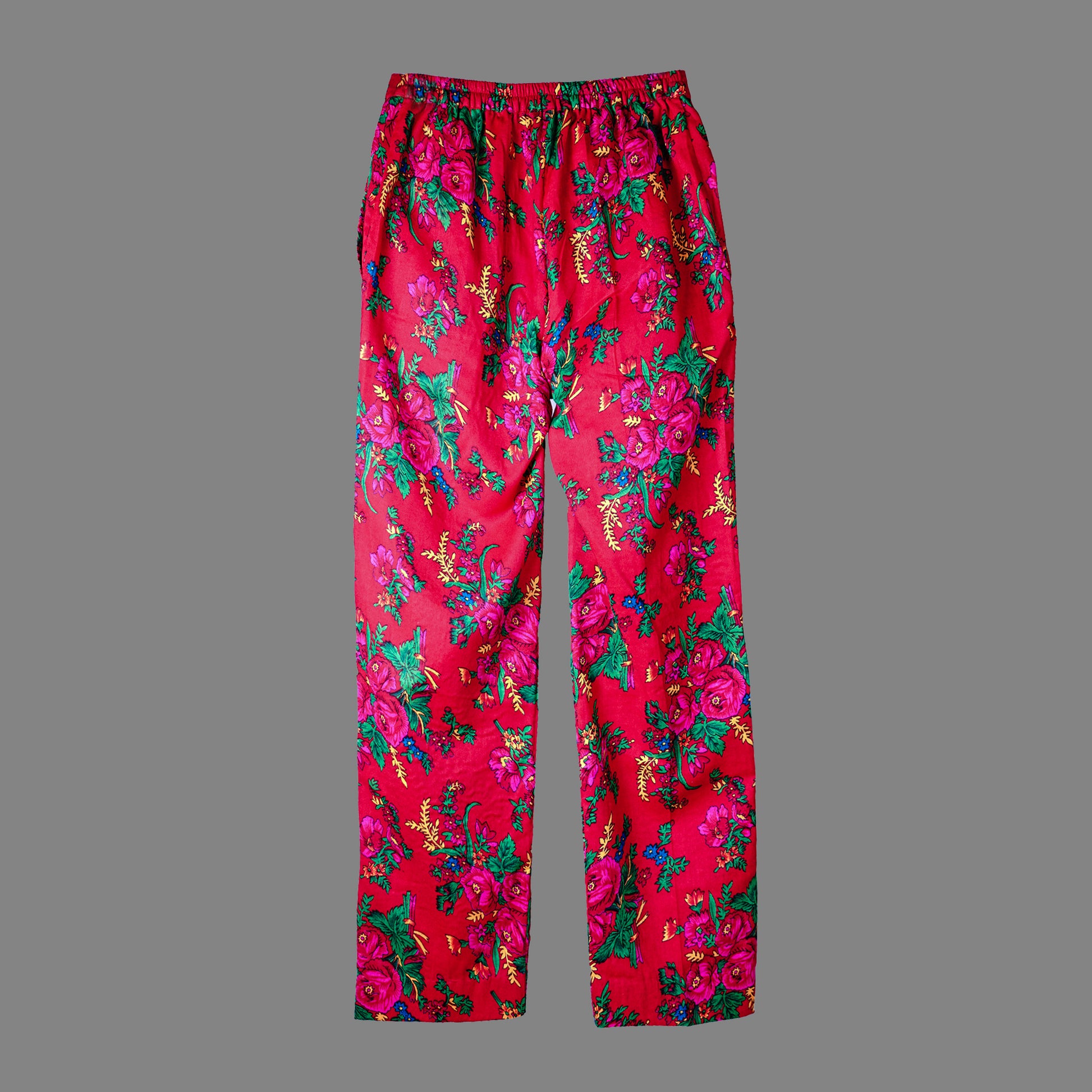 Missus - OI is a traditional pant crafted in floral-printed fabric with a contrasting red lining and a quilted waistband for added comfort. Designed with a center-front zip and straight side pockets, it balances functionality with a clean, modern silhouette. Reflecting quiet structure beneath an expressive surface, Missus - OI is finished with YBQ signature Heart and Braille logos.