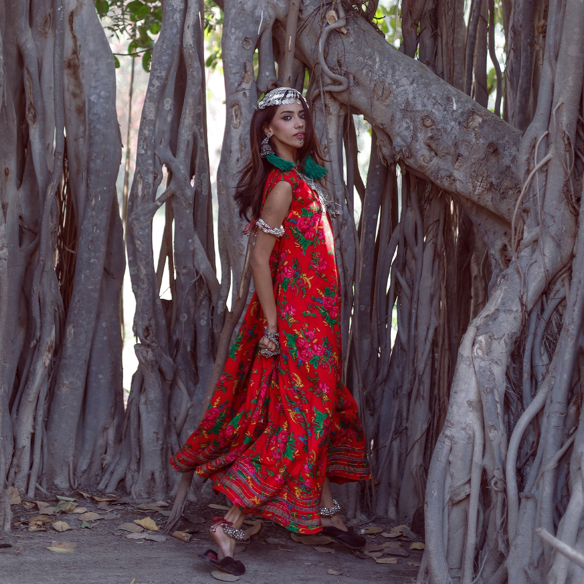Ramz is a sleeveless, long airline frock crafted from printed fabric with velvet finishing and red lining. Designed with a round neckline and a concealed zip at the back, it features frayed edges at the hem accented with traditional Susi gota contrast lace detailing. The look is completed with YBQ signature Heart and Braille logos.