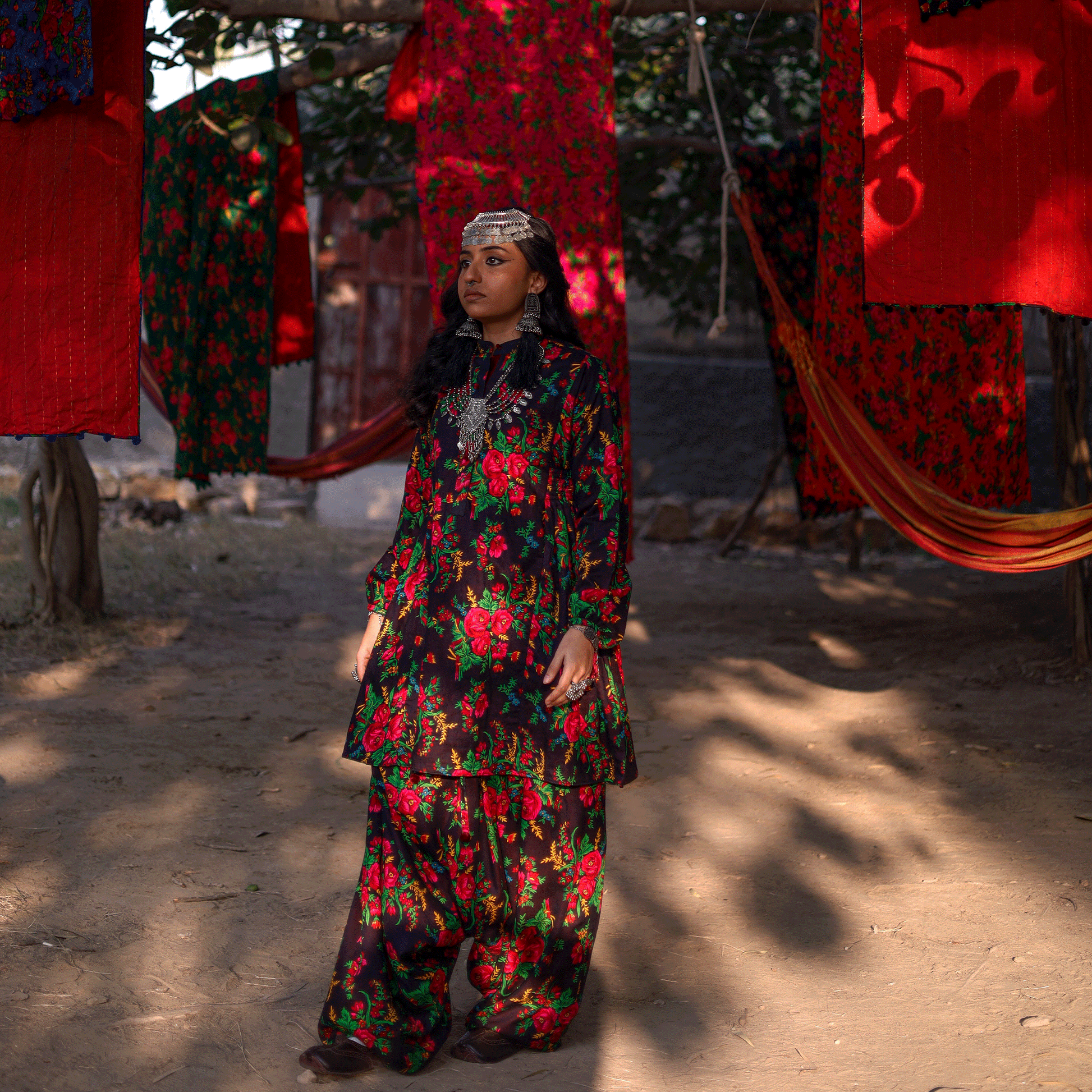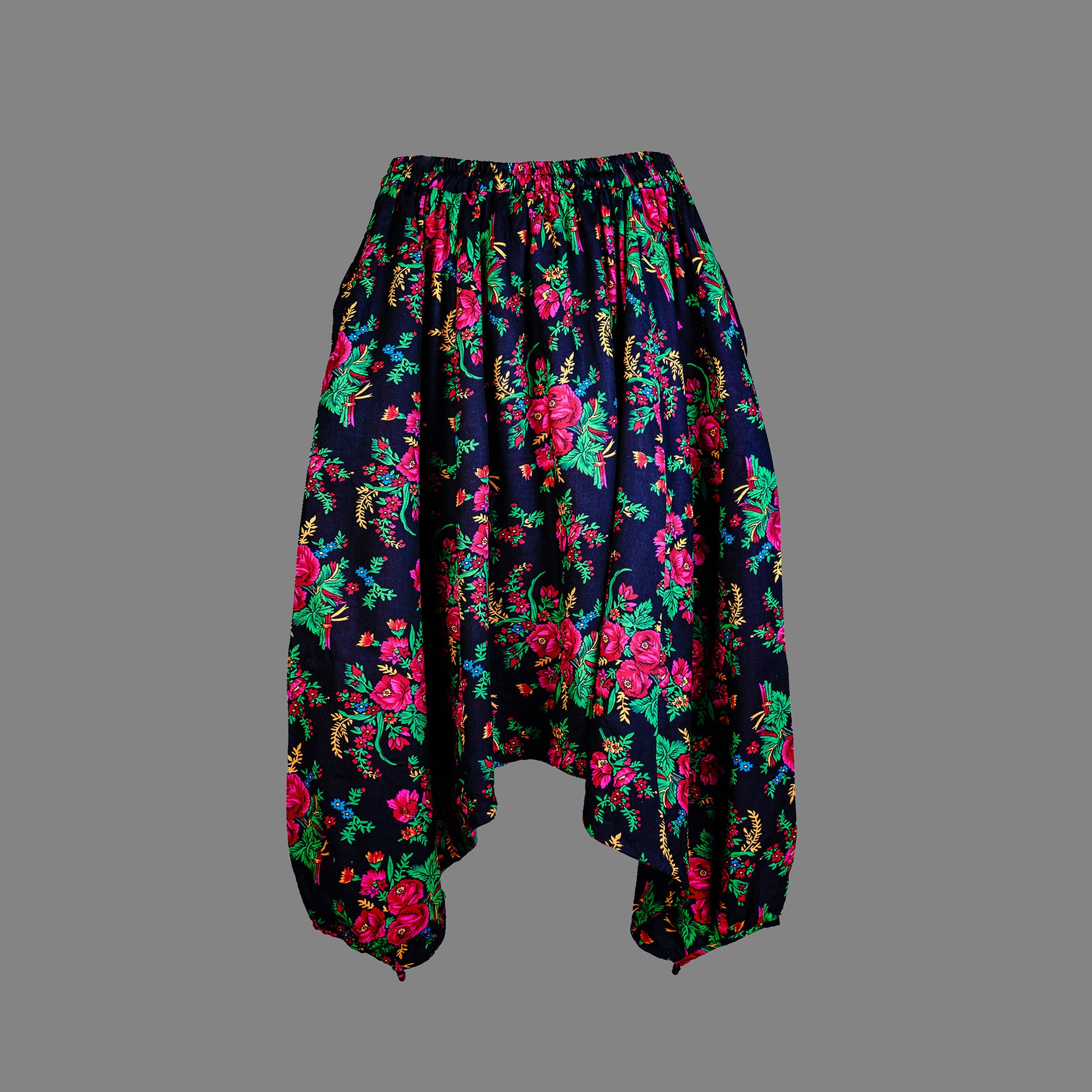 Tulsi - OI is our unisex drape shalwar crafted in floral printed fabric with velvet finishing. Designed for comfort and movement, it features side slits at the hem, side pockets, and a hoop fastening for ease. Velvet pom pom tassels accent the belt, adding texture and depth, finished with YBQ signature Heart and Braille logos.